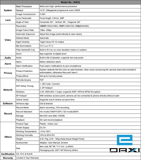 სამეთვალყურეო კამერა 2MP, SriHome SH032, WiFi, 3.6mm Lens, White, Indoor