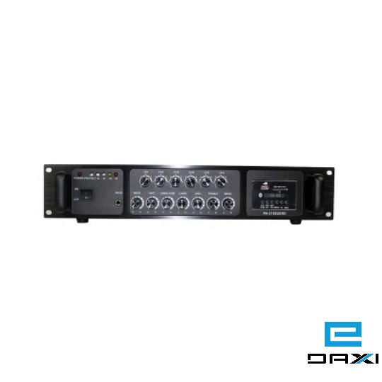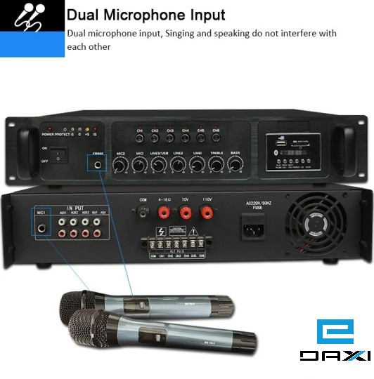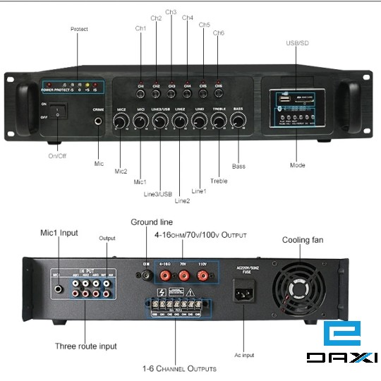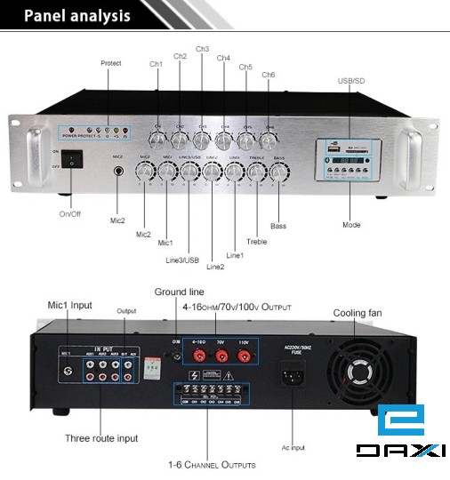 1. 2-channel microphone, 3-channel line input, six-zone independent control, each channel can independently load 75% of the total power, and the volume of each channel can be independently controlled.