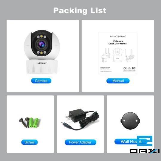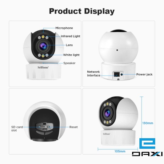 | Record | Record Mode:Motion detection alarm recording, 7/24 recording Record Standard:HD mode(1440P) / SD mode(360P) Storage:MicroSD card (Max 128GB),support phone and NVR record File size:about 10G/24h Playback:SriHome APP record playback, NVR |