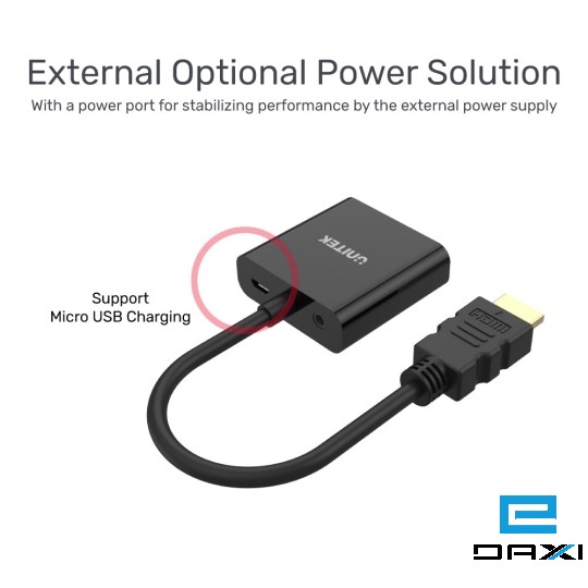 This adapter helps convert the signal from HDMI interface to VGA, with audio output port to let you sync the video and audio. With an optional external power port to help stabilize the performance. Product Features: