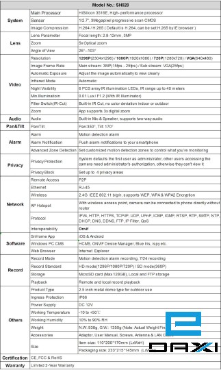 სამეთვალყურეო კამერა, SriHome 3MP SH028 FHD, 1296P(2304*1296), H.264 / H.265, 2.8-12mm, 5x Optical Zoom, auto Focus