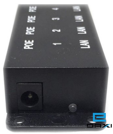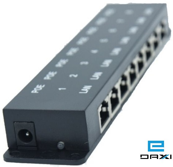 The PoE injector is suitable for powering up to eight devices supporting passive PoE. To LAN ports on one side connect device without power supply eg switch, on the other side connect devices using passive PoE - WiFi, VoIP or other devices supporting passive PoE. The power supply uses two unused pairs of ethernet cable: 4,5 (positive pole) and 7,8 (negative pole). Power connector has stadard 2.1 / 5.5mm size.