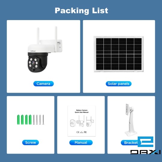 | Other | Product type: Battery camera Power interface: Type C DC5V Battery specification: 2*2000mA Battery Pack (built-in) Working temperature: -10℃ ~50℃ Waterproof degree: IP65 Working power consumption: 1.5~5W(daytime 1.5W) Standby power consumption: less than 0.003w Working humidity: 10%-90% RH Weight: N.W.:360g, G.W.: 1200g (subject to real weight) Accessories: 2*Bracket, 1*Manual, 1*Wooden screw (including installation screwdriver, Card pick pin), 1 Solar panel(3W) |