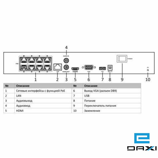 - PoE პორტები: გააჩნია 8 PoE (Power over Ethernet) პორტი, რაც საშუალებას აძლევს კამერების პირდაპირ რეგისტრატორიდან კვებას დამატებითი კვების წყაროს გარეშე.