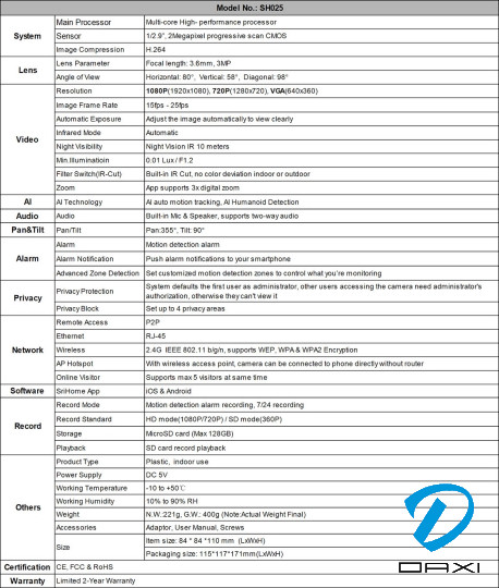სამეთვალყურეო კამერა, SriHome SH025, 3MP, WiFi, 3.6mm, White, Indoor