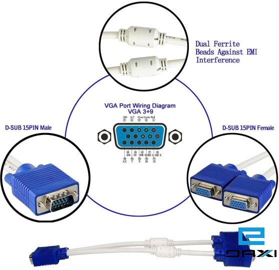 VGA Male to 2 Dual Female Y Adapter Splitter Cable 15 Pin