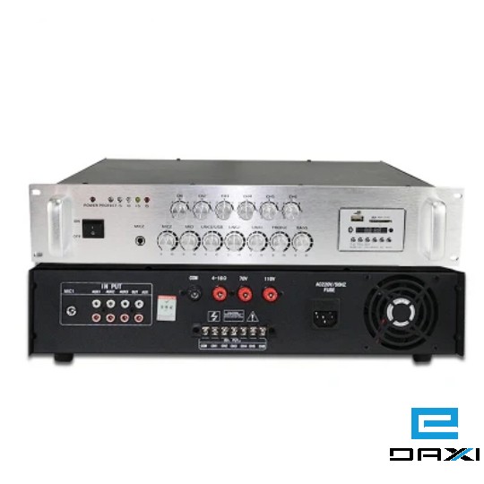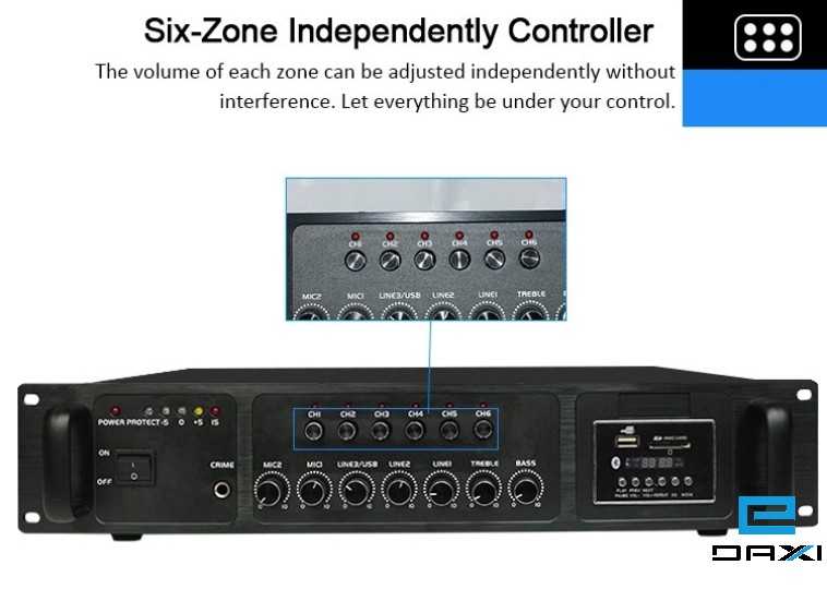 1. 2-channel microphone, 3-channel line input, six-zone independent control, each channel can independently load 75% of the total power, and the volume of each channel can be independently controlled.