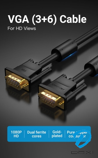 VGA Cable, 1.5M DAEBG, VENTION (3+6) Male to Male Cable with ferrite cores Black