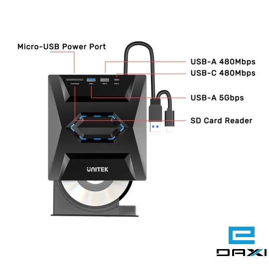External Optical Drive with USB Hub 5-in-1, T1037A01, UNITEK ,SD Card Reader