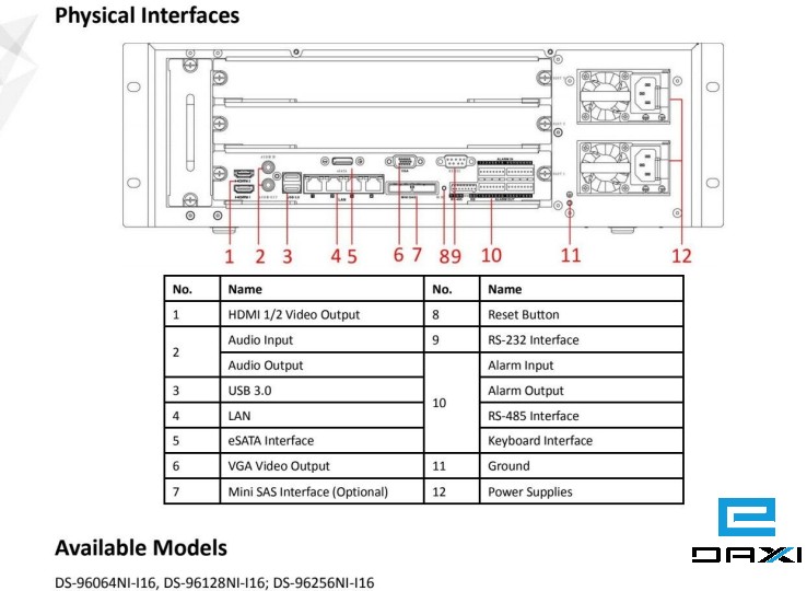 - Extension BoardOne extension board is supported with four 10M/100M/1000M optical interfaces (1.25 Gbps SFP module), eight RS-485 interfaces, and alarm interface of 32 alarm inputs and 16 alarm outputs.